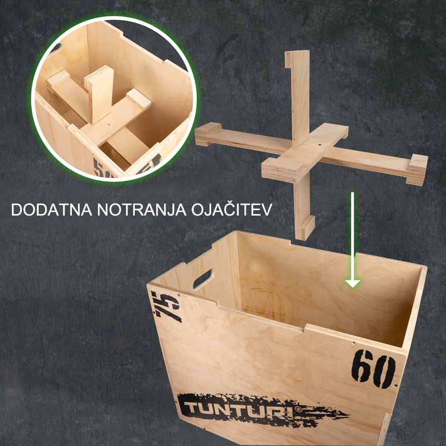 Lesena vadbena pliometrična škatla s tremi različnimi višinami. Možnost uporabe višine na 50 cm, 60 cm ali 75 cm.