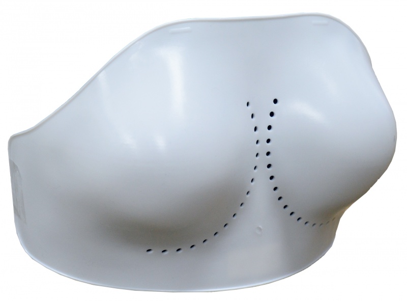 Ženski ščitnik za prsi bele barve, je narejen iz obstojnega trdega polietilena. Ima oblikovan prsni del, ki je bolj ojačan in mehkejši stranski del.