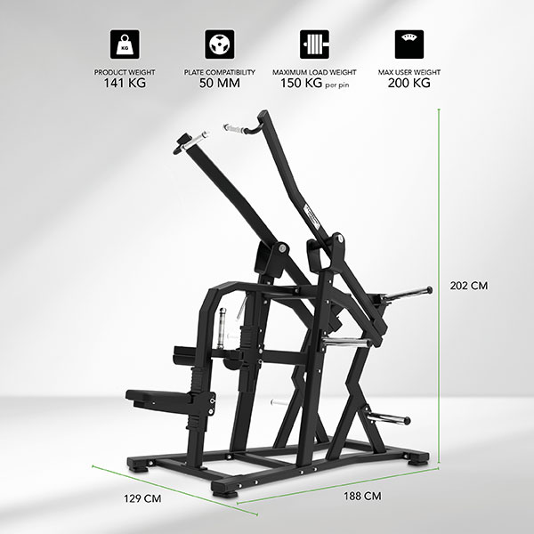 Z širokim oprijemom cilja na zgornji del hrbta in mišice latissimus dorsi, medtem ko upor utežnih plošč omogoča naraven in progresiven razvoj moči. Idealno za uporabnike, ki želijo povečati širino hrbta in definirati mišice.